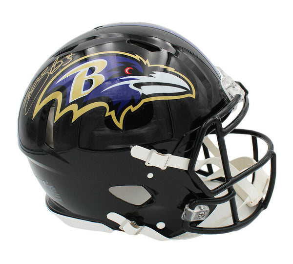 A Baltimore Ravens Speed Authentic NFL Helmet hand signed by Willis McGahee. The item and signature are in excellent condition. Willis is a former running back. He played college football at Miami, where he was recognized as a consensus All-American, and was drafted by the Buffalo Bills in the first round of the 2003 NFL Draft. In addition to his time with the Bills, McGahee played for the Baltimore Ravens, Denver Broncos, and Cleveland Browns. He is a 2x Pro Bowler (2007, 2011), PFWA NFL Comeback Player of the Year (2004), Heisman Trophy finalist (2002), and Big East Offensive Player of the Year (2002). AUTHENTICATION: The item is accompanied by a Certificate of Authenticity - Serial Numbered and Databased Hologram - Picture of Willis from the Signing