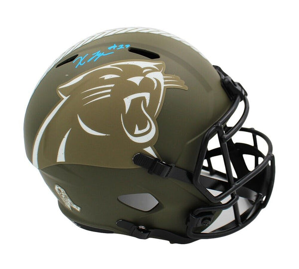 A Carolina Panthers Speed Replica Salute to Service NFL Helmet hand signed by Xavier Leggette. The item and signature are in excellent condition. Xavier is a wide receiver and played for the South Carolina Gamecocks in college. He was drafted in the 2024 NFL Draft in the first round. AUTHENTICATION: Your item has been tagged with a SmarTag powered by Prova technology, which gives you digital access to your items authentication records, including a proof picture from the signing.