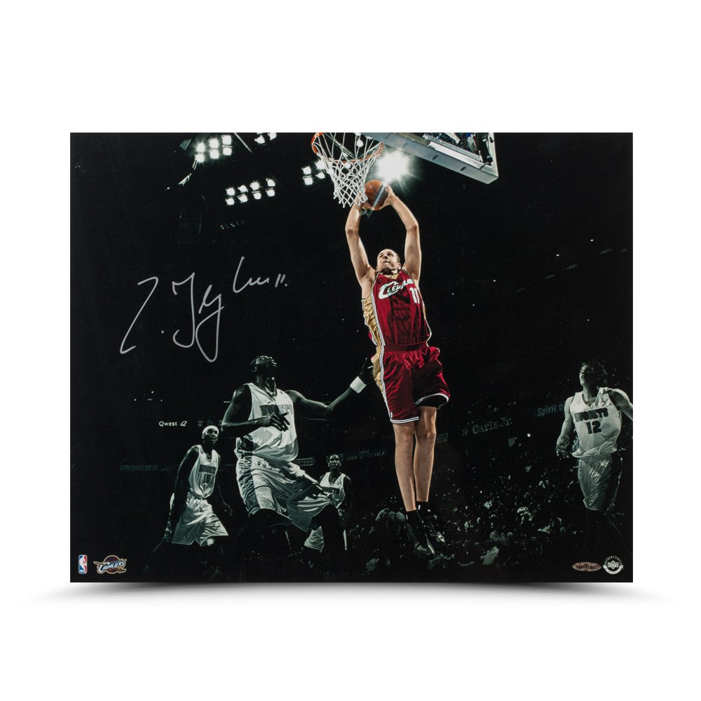 Standing 7-foot-3 is one thing. Having the athleticism of a professional athlete is another. Coupling that with a relentless work ethic is what made Zydrunas Ilgauskas one of the best players in Cleveland Cavaliers history. He played the game among the trees, annually ranking among the league leaders in rebounding and blocked shots. On 11/1/02, het set a career high with 22 rebounds and added 17 points in a game against the Suns. A little more than three years later, he matched a career high with seven blocked shots in a 100-91 win over the Bulls (2/23/05). He blocked seven shots in a game three times in his career. In an era when big men began to dominate like decades previous, Ilgauskas was one of the NBA's best. In this designed image, Big Z is rising up for a thunderous dunk against the Nuggets. Ilgauskas has signed this Rising Up 16" x 20" image in silver paint pen. His signature is deemed authentic by virtue of Upper Deck Authenticated's Five Step Process.
