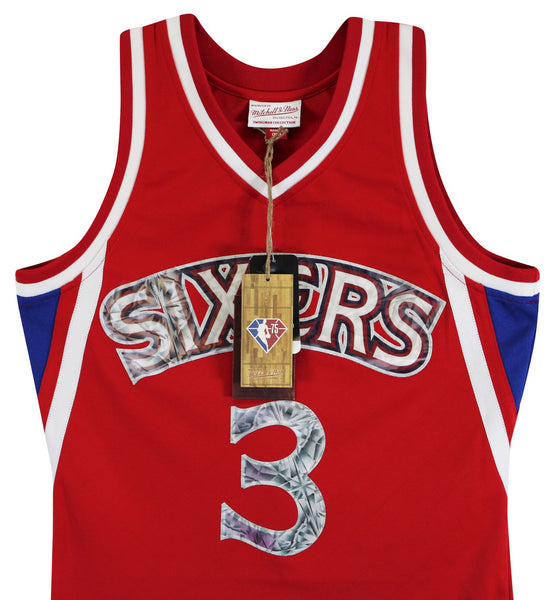 This Autographed Red 75th Anniversary Mitchell & Ness 1996-97 Hardwood Classics Swingman Jersey has been Personally Signed by Allen Iverson of the Philadelphia 76ers. This item is 100% Authentic to include a hologram by Beckett Authentication Services. This item will come with an affixed Beckett Authentication Services (BAS) authentication sticker, which includes a scannable QR code to verify authenticity. Please note that Beckett no longer provides serial-numbered COA cards, and the attached BAS sticker will serve as the complete authentication for this item. This is a BAS Witnessed Protection Program item which means a Beckett Authentication Service representative was present when this item was being signed. We have multiples of this same item. While the photographs are representative of this item, the size, placement and strength of the signature may vary. Each item is hand signed, therefore, each autograph is unique. This is a Small sized Jersey.
