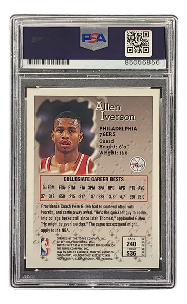 Featured is an Allen Iverson signed 1997 Topps Finest #240 Philadelphia 76ers rookie card. This card has been hand signed by Iverson and has been authenticated and encapsulated by PSA. This card would make a great addition to any sports memorabilia collection! **Please note: Stock Image used. Signature may vary.** SPECIFICATIONS Autographed By: Allen Iverson Team: Philadelphia 76ers Sport: Basketball Authentication: Professional Sports Authenticator (PSA)