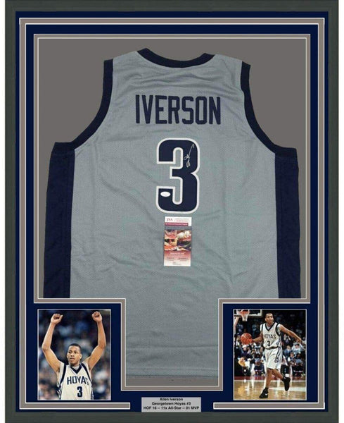 Framed Autographed/Signed Allen Iverson 33x42 Georgetown Grey Jersey JSA COA The item is professionally framed and matted with two 5x7 photos, measures 35 inches by 39 inches and is ready to be hung in your man cave! Photo and matting requests can be made.