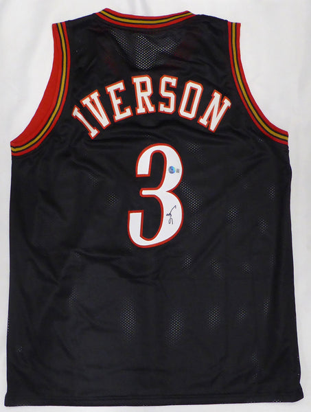 This is a Black Jersey that has been hand signed by Allen Iverson. This is a custom jersey with no name brand. The approximate size is XL. It has nice sewn in name and numbers. This item has been certified authentic by Beckett Authentication (BAS) and comes with their tamper-proof QR Code hologram.
