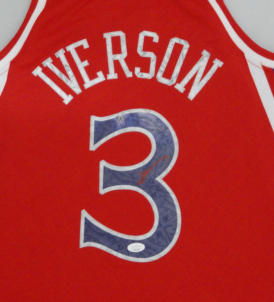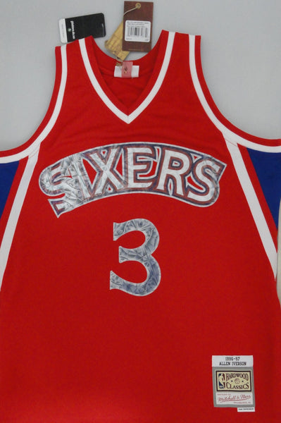 autographed Official Mitchell & Ness Jersey of Philadelphia 76ers Hall of Famer ALLEN IVERSON. This jersey is signed with Red Paint Pen. This jersey is size Large with all letters and numbers sewn in. This item was signed at a private signing with us and would make a great addition to any Iverson and 76ers collection. This autograph is guaranteed to be 100% authentic and will include a COA hologram from JSA authentication.