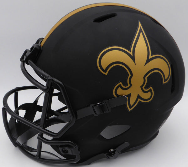 This is an Eclipse Black Full Size Replica Helmet that has been hand signed by Alvin Kamara. There is an imperfection in the signature as shown. This item has been certified authentic by Beckett Authentication (BAS) and comes with their tamper-proof QR Code sticker that can be verified on the Beckett-authentication.com.