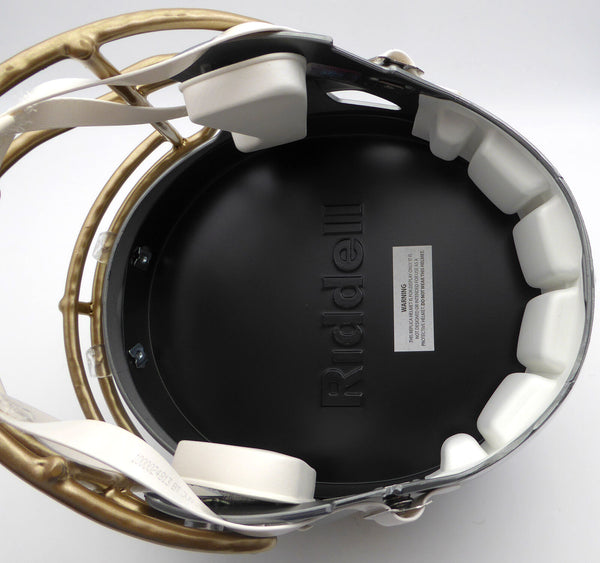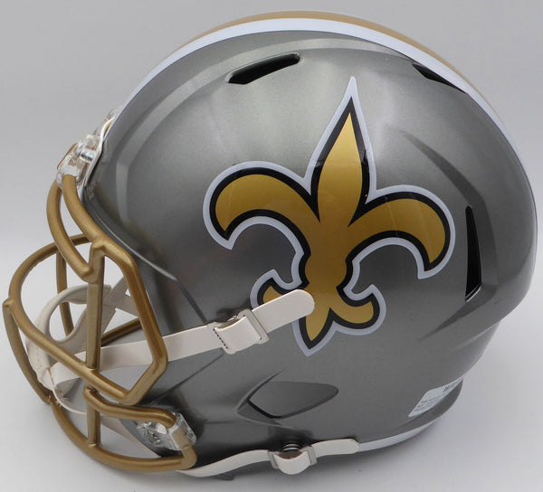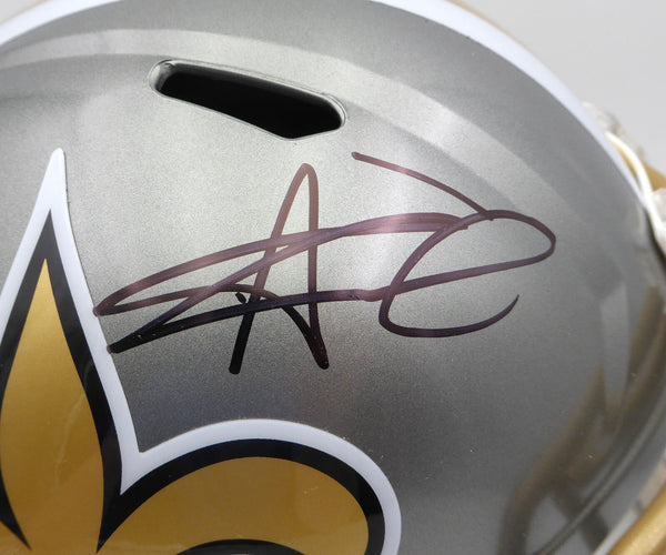 This is a Flash Gold Full Size Replica Helmet that has been hand signed by Alvin Kamara. There is an imperfection in the signature as shown. This item has been certified authentic by Beckett Authentication (BAS) and comes with their tamper-proof QR Code sticker that can be verified on the Beckett-authentication.com.