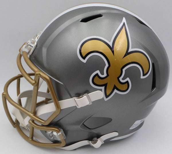 This is a Flash Gold Full Size Replica Helmet that has been hand signed by Alvin Kamara. There is an imperfection in the signature as shown. This item has been certified authentic by Beckett Authentication (BAS) and comes with their tamper-proof QR Code sticker that can be verified on the Beckett-authentication.com.