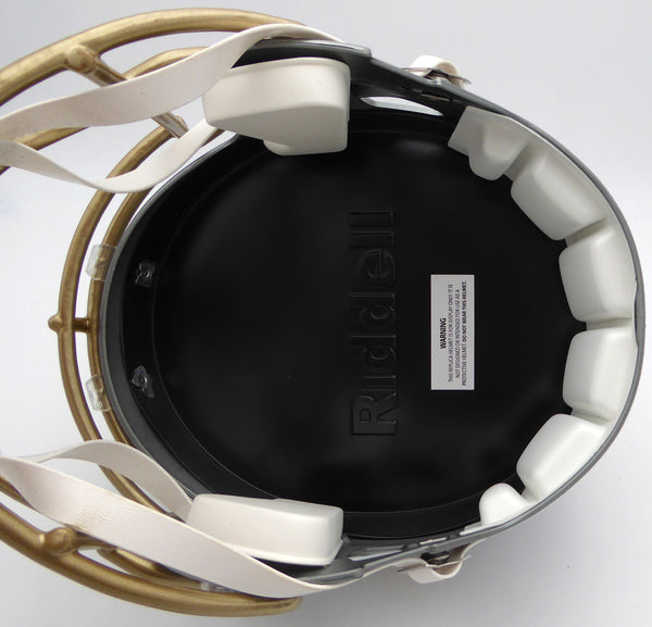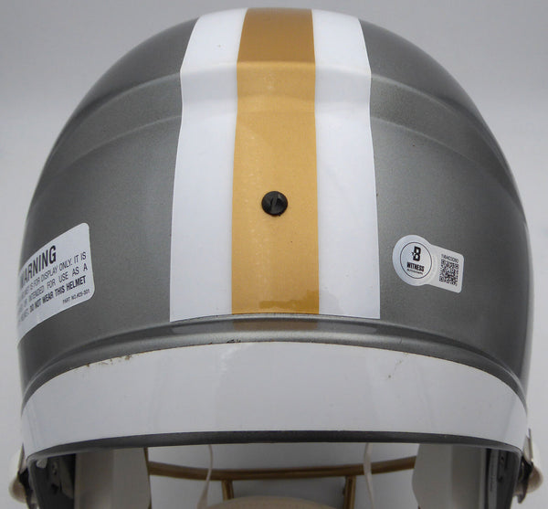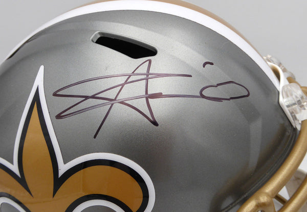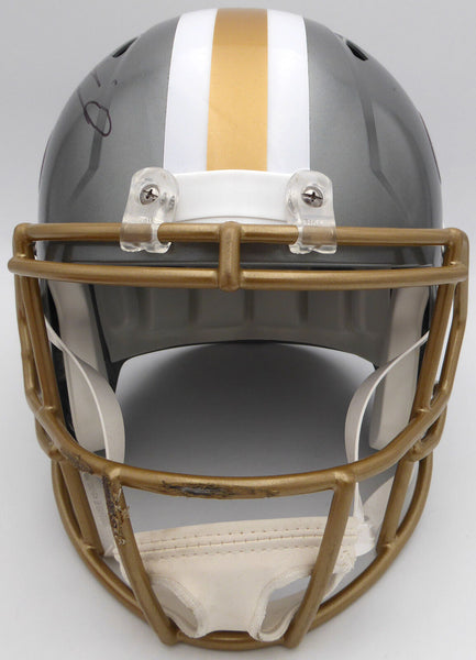 This is a Gold Flash Full Size Replica Helmet that has been hand signed by Alvin Kamara. The Flash helmets are delicate and may have some marks or scratches on them. NOTE: The facemask is scuffed, as shown in the pictures. This item has been certified authentic by Beckett Authentication (BAS) and comes with their tamper-proof QR Code sticker that can be verified on the Beckett-authentication.com.