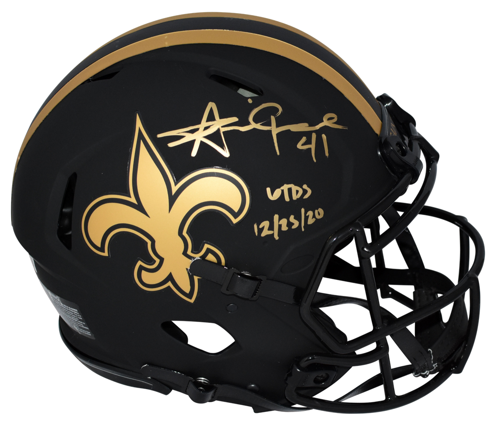 Alvin Kamara, All-Pro running back for the New Orleans Saints, has hand signed this Saints Riddell Speed Eclipse full-size authentic helmet at a private signing. He included the inscription "6 TD's 12/25/20" with his signature. This helmet is fully padded inside like the ones worn on the field. This item is authenticated by Beckett Authentication Services, one of the best authenticators in the industry. Their tamper-evident hologram featuring a QR code and serial number is on the item. The authenticity can be verified online by entering the serial number or scanning the QR code.Item pictured may not be the exact item you will receive. It will be similar quality, and we guarantee your satisfaction.