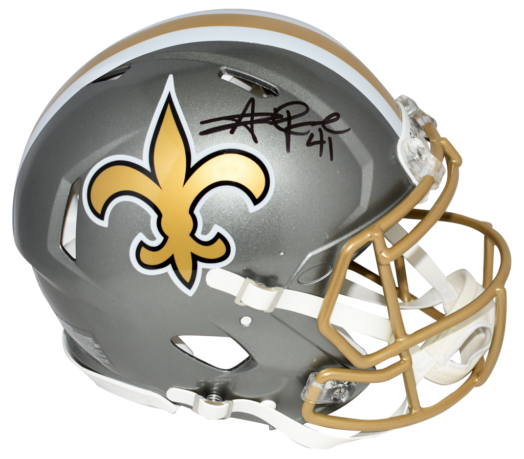 Alvin Kamara, All-Pro running back for the New Orleans Saints, has hand signed this Saints Riddell Speed Flash full-size authentic helmet at a private signing. This helmet is fully padded inside like the ones worn on the field. This item is authenticated by Beckett Authentication Services and was signed in the presence of one of their representatives. Their tamper-evident hologram featuring a QR code and serial number is on the item. The authenticity can be verified online by entering the serial number or scanning the QR code.Item pictured may not be the exact item you will receive. It will be similar quality, and we guarantee your satisfaction.