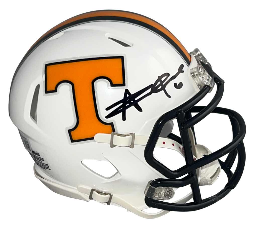 Alvin Kamara, former star running back for the Volunteers, has hand signed this Tennessee Riddell Speed Dark Mode mini helmet at a private signing. This item is authenticated by Beckett Authentication Services and was signed in the presence of one of their representatives. Their tamper-evident hologram featuring a QR code and serial number is on the item. The authenticity can be verified online by entering the serial number or scanning the QR code.Item pictured may not be the exact item you will receive. It will be similar quality, and we guarantee your satisfaction.