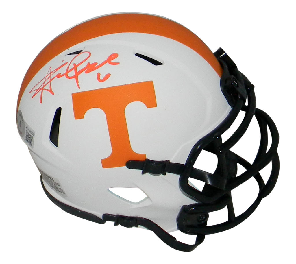 Alvin Kamara, former star running back for the Volunteers, has hand signed this Tennessee Riddell Speed Lunar mini helmet at a private signing. This item is authenticated by Beckett Authentication Services, one of the best authenticators in the industry. Their tamper-evident hologram featuring a QR code and serial number is on the item. The authenticity can be verified online by entering the serial number or scanning the QR code.Item pictured may not be the exact item you will receive. It will be similar quality, and we guarantee your satisfaction.