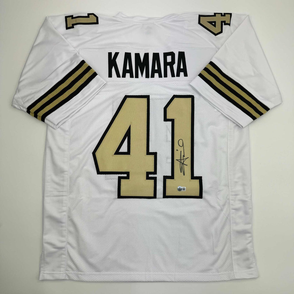 Autographed/Signed Alvin Kamara New Orleans White Color Rush Jersey BAS COA Jersey has no brand names or logos. This is a custom jersey and was not manufactured by or in any manner associated with any professional sports league or manufacturer. This custom jersey carries no professional sports league designation. The item is intended to be an autographed collectible. The custom jersey displays the name and number of the player. This item in no way is affiliated with or connected to any professional sports organization. Size is XL.