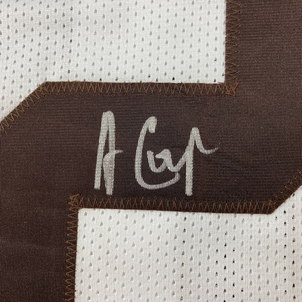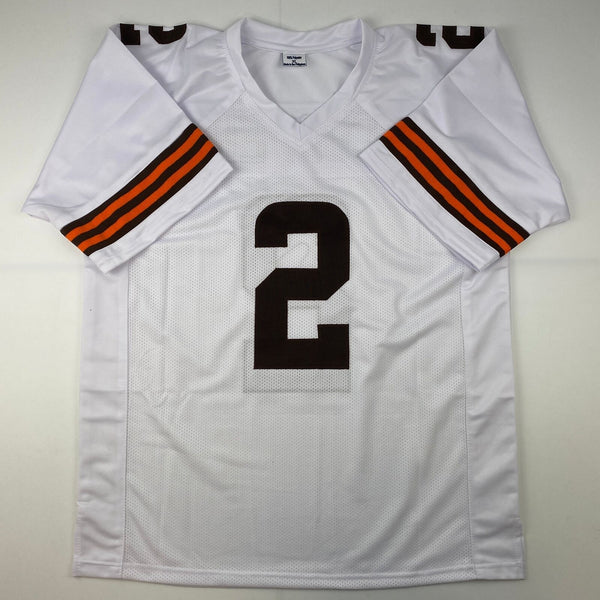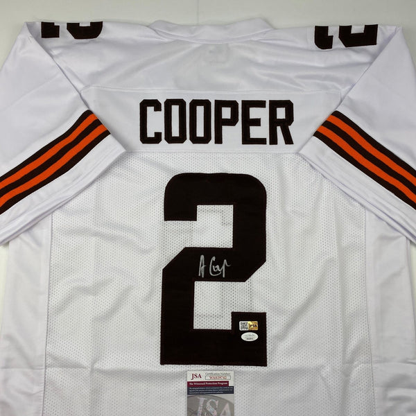 Autographed/Signed Amari Cooper Cleveland White Football Jersey JSA COA Jersey has no brand names or logos. This is a custom jersey and was not manufactured by or in any manner associated with any professional sports league or manufacturer. This custom jersey carries no professional sports league designation. The item is intended to be an autographed collectible. The custom jersey displays the name and number of the player. This item in no way is affiliated with or connected to any professional sports organization. Size is XL.