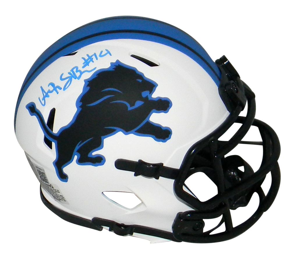 Amon-Ra St Brown, star wide receiver for the Detroit Lions, has hand signed this Lions Riddell Speed Lunar mini helmet at a private signing. This item is authenticated by Beckett Authentication Services and was signed in the presence of one of their representatives. Their tamper-evident hologram featuring a QR code and serial number is on the item. The authenticity can be verified online by entering the serial number or scanning the QR code.Item pictured may not be the exact item you will receive. It will be similar quality, and we guarantee your satisfaction.