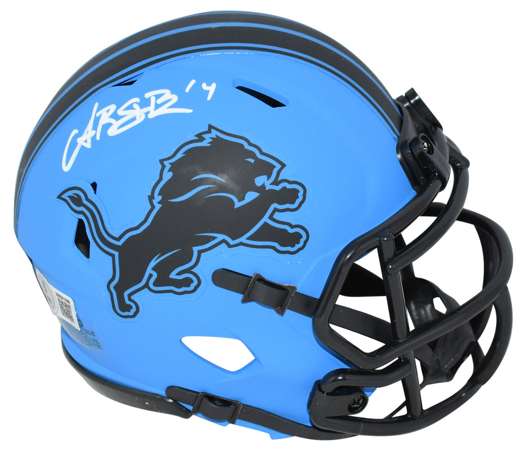 Amon-Ra St Brown, star wide receiver for the Detroit Lions, has hand signed this Lions Riddell Speed Rave mini helmet at a private signing. This item is authenticated by Beckett Authentication Services and was signed in the presence of one of their representatives. Their tamper-evident hologram featuring a QR code and serial number is on the item. The authenticity can be verified online by entering the serial number or scanning the QR code.Item pictured may not be the exact item you will receive. It will be similar quality, and we guarantee your satisfaction.