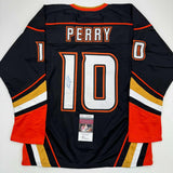 Autographed/Signed Corey Perry Anaheim Black Hockey Jersey JSA COA Jersey has no brand names or logos. This is a custom jersey and was not manufactured by or in any manner associated with any professional sports league or manufacturer. This custom jersey carries no professional sports league designation. The item is intended to be an autographed collectible. The custom jersey displays the name and number of the player. This item in no way is affiliated with or connected to any professional sports organization. Size is XL