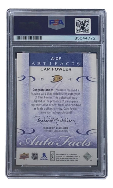 Featured is a Cam Fowler signed 2014/15 Upper Deck Artifact #A-CF Anaheim Ducks trading card. This card has been hand signed by Fowler and has been authenticated and encapsulated by PSA. This card would make a great addition to any sports memorabilia collection!. SPECIFICATIONS Autographed By: Cam Fowler Team: Sport: Hockey Authentication: Professional Sports Authenticator (PSA)