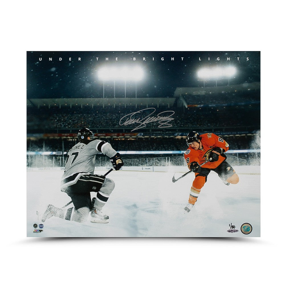 With tremendous success of the NHL Winter Classic and NHL Heritage Classic outdoor games, the league staged the NHL Stadium Series in the 2013-14 season. In one of the four games, the Los Angeles Kings took on the Anaheim Ducks on 1/25/14 in front of 54,099 fans at Dodger Stadium. The Ducks came away victorious in a 3-0 shutout. In the first period, Ducks legend Teemu Selanne assisted on Matt Beleskey's goal. It was the 21st and final NHL season of what will surely be a Hall of Fame career. He was selected to 10 All-Star Games in a career that saw him finish in the top 20 in many offensive categories, including goals (11th), points (15th) and game-winning goals (third). He's seen here threading the puck past Kings defenseman Alec Martinez in the famous game. Selanne has signed this limited edition (50) Under the Bright Lights 16" x 20" image in silver paint pen. His signature is deemed authentic by virtue of Upper Deck Authenticated's Five Step Process.