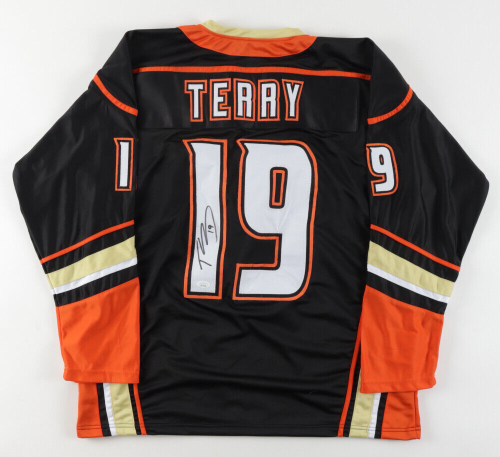 Custom on-ice style jersey. Everything is sewn on, size XL. Hand-signed by Troy Terry.The lot / autograph(s) includes an official James Spence Authentication (JSA) hologram and matching COA for authenticity purposes. The signing of this item was witnessed by JSA.Authentication: JSA COA