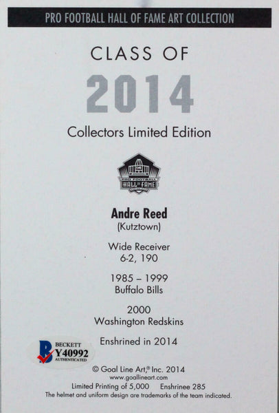 Andre Reed Autographed Buffalo Bills Goal Line Art Card w/ HOF- Beckett *Black This is an Andre Reed of the Buffalo Bills hand autographed goal line art card inscribed with HOF. This item has a Beckett Authentication, which comes with a Beckett numbered and a matching Certificate of Authenticity. You can view this item on the Beckett Authentication website. It was signed either at a public autograph appearance or a private signing. This is a stock photo of the item. Although you may not receive this exact item, the item you receive is virtually identical, brand new, and in great shape.