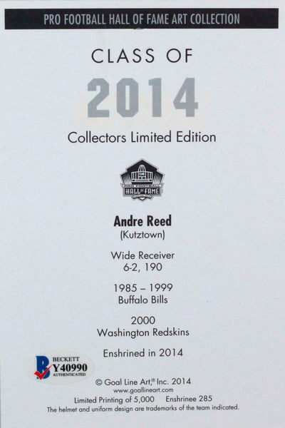 Andre Reed Autographed Buffalo Bills Goal Line Art Card w/ HOF- Beckett *Blue This is an Andre Reed of the Buffalo Bills hand autographed goal line art card inscribed with HOF. This item has a Beckett Authentication, which comes with a Beckett numbered and a matching Certificate of Authenticity. You can view this item on the Beckett Authentication website. It was signed either at a public autograph appearance or a private signing. This is a stock photo of the item. Although you may not receive this exact item, the item you receive is virtually identical, brand new, and in great shape.