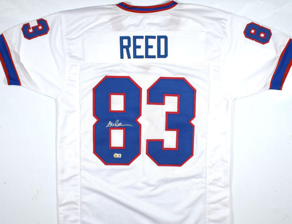 Andre Reed Autographed White Pro Style Jersey - Beckett W Hologram *Silver THIS IS NOT AN NFL JERSEY. THIS HAS NO TAGS, NO LOGOS, NO EMBLEMS. This is a hand autograph of Andre Reed on a custom (Non Name Brand) Authentic style Jersey with stitched letters and numbers. This item has a Beckett Witnessed Authentication, which comes with a Beckett numbered hologram and a QR code for verification. You can view this item on the Beckett Authentication website, it shows when and where the item was signed. It was signed either at a public autograph appearance or a private signing. This is a stock photo of the item. Although you may not receive this exact item, the item you receive is virtually identical and brand new in great shape. Jersey size is XL.