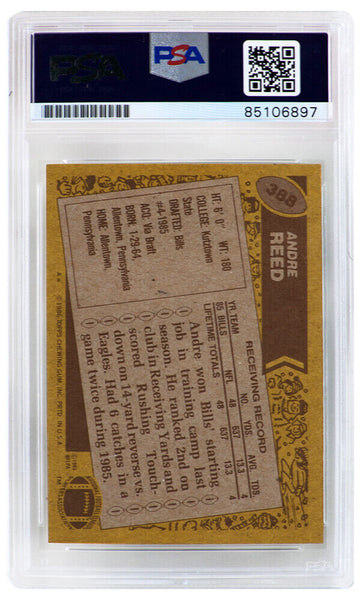 Andre Reed signed Buffalo Bills 1986 Topps rookie football trading card #388. The card has been authenticated and encapsulated by PSA/DNA and the number can be verified online.