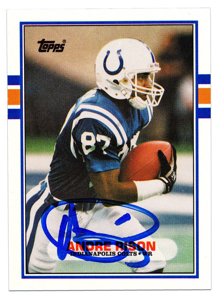 Andre Rison Signed Colts 1989 Topps football rookie trading card #102T. Item comes with a Schwartz Sports Memorabilia tamper-proof numbered hologram (on back of physical card) and Certificate of Authenticity which can be verified online.