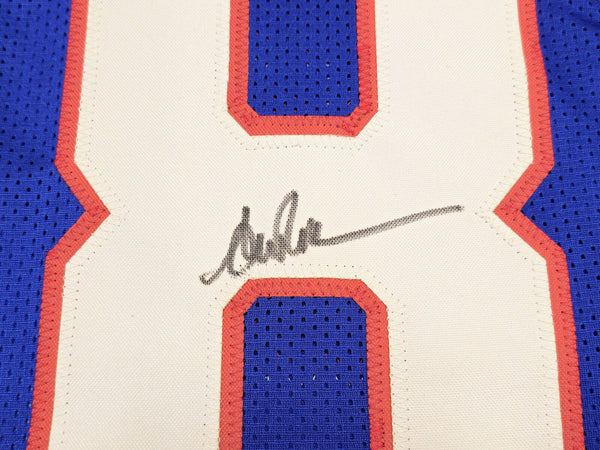 This is a Blue Jersey that has been hand signed by Andre Reed. This is a custom jersey with no name brand. The approximate size is XL. It has nice sewn in name and numbers. This item has been witnessed and is certified authentic by JSA and comes with their tamper-proof hologram and matching certificate of authenticity.
