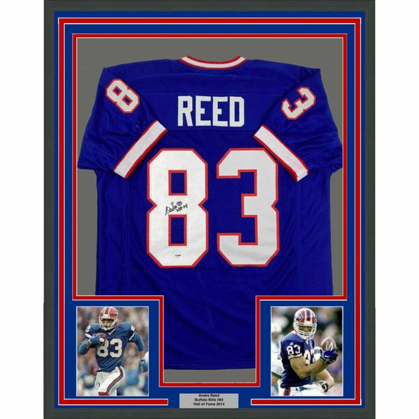 FRAMED Autographed/Signed ANDRE REED HOF 14 33x42 Buffalo Blue Jersey PSA COA The item is professionally framed & matted with two 8x10 photos, measures 33"x42" and is ready to be hung in your man cave! NOTE: COA card will be mounted on the back of the frame, not inside it on top of the jersey as seen in the picture. Please allow up to 5 business days for the item to be framed, packaged safely, and picked up by USPS. Photo and matting requests can be made.