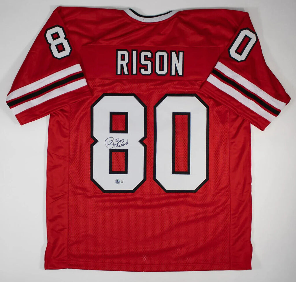 Custom on-field style jersey. Everything sewn on, size XL. Hand-signed and inscribed by Andre Rison.The lot / autograph(s) includes an official Beckett Authentication Service (BAS) hologram and QR Code card for authenticity purposes. The signing of this item was witnessed by Beckett.Authentication: Beckett QR Code card