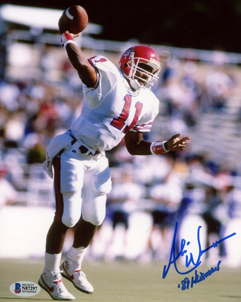 Andre Ware, former Heisman Trophy winning quarterback for the Houston Cougars, has hand signed this 8x10 photo at a private signing. This item comes with a certificate of authenticity (COA) from Beckett Authentication Services and was signed in the presence of one of their representatives. You will receive a serial-numbered COA along with a matching serial-numbered sticker on the photo. The authenticity can be verified online by entering the serial number.Item pictured may not be the exact item you will receive. It will be similar quality, and we guarantee your satisfaction.