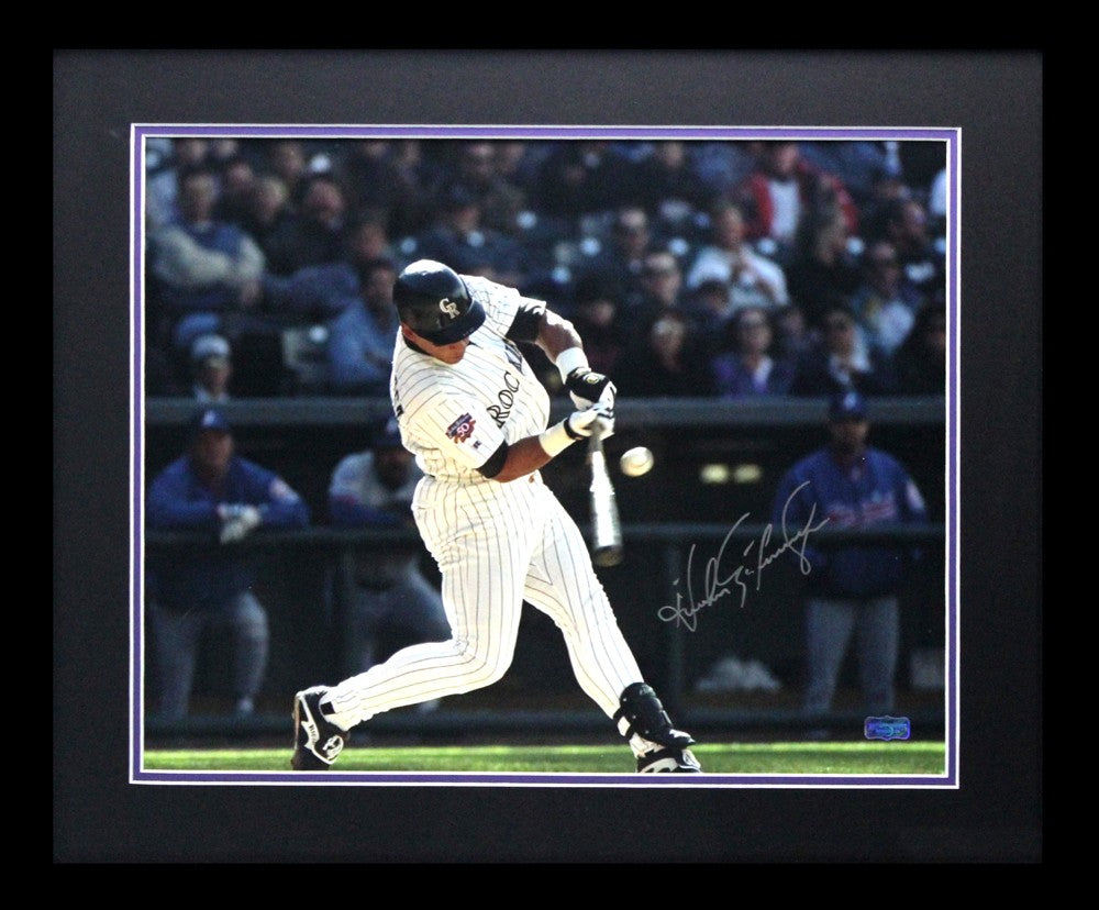 A Colorado Rockies 16x20 Framed ball on bat Photo hand signed by Andres Galarraga. The item and signature are in excellent condition. Galarraga is a 5x All-Star, won two National League Gold Glove Awards, two NL Silver Slugger Awards, and won the MLB Comeback Player of the Year Award. AUTHENTICATION: The item is accompanied by a Certificate of Authenticity - Serial Numbered and Databased Hologram - picture of Andres from the signing.