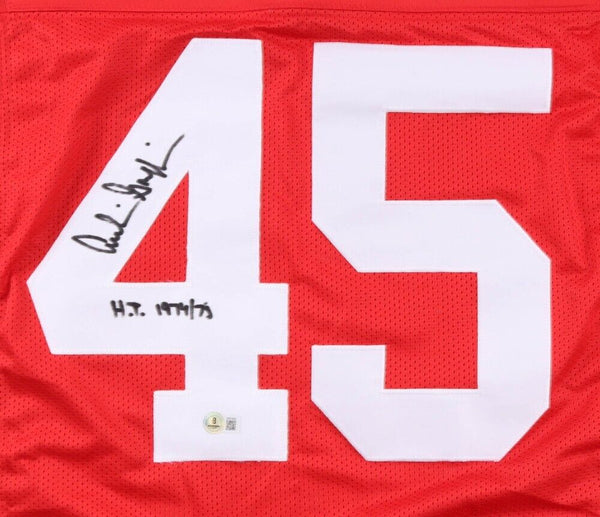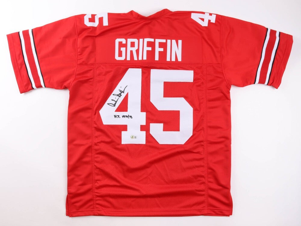 Custom on-field style jersey. Everything is sewn on, size XL. Hand-signed by Archie Griffin.The lot / autograph(s) includes an official Beckett Authentication Services serially-numbered hologram and QR Code card for authenticity purposes.Authentication: Beckett QR Code card