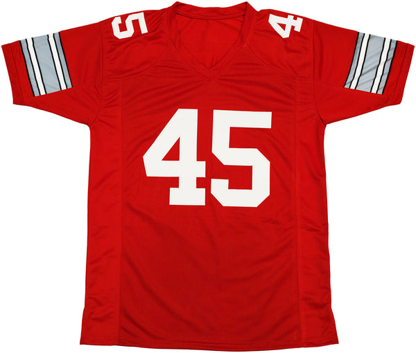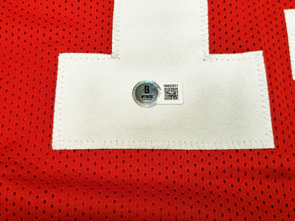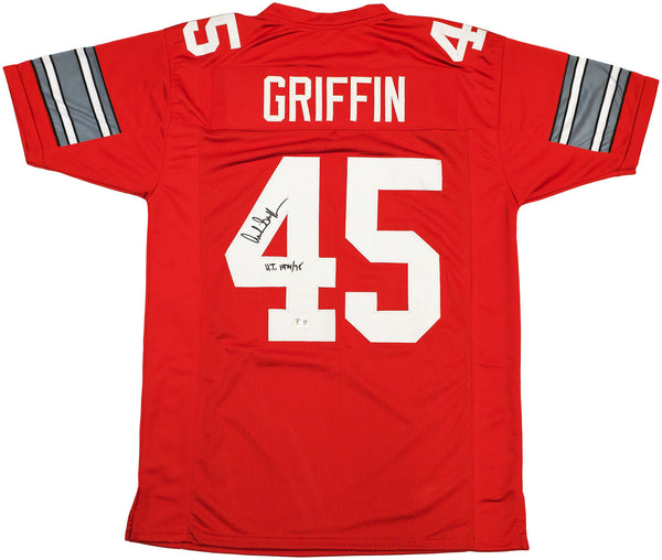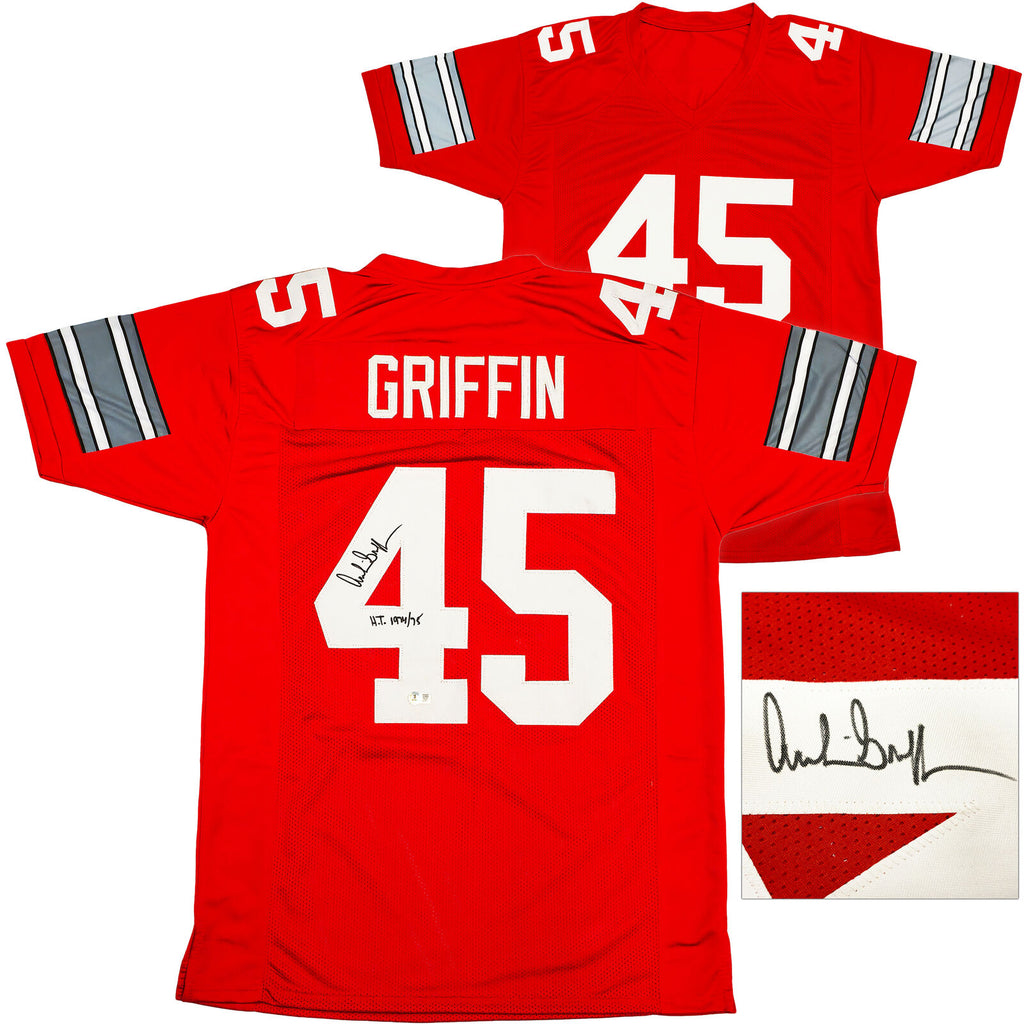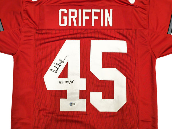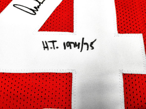 This is a Red Jersey that has been hand signed by Archie Griffin. This is a custom jersey with no name brand. The approximate size is XL. It has nice sewn in name and numbers. This item was inscribed "HT 1974/75." This item has been witnessed and certified authentic by Beckett Authentication (BAS) and comes with their tamper-proof witness sticker.