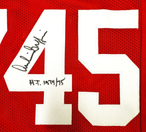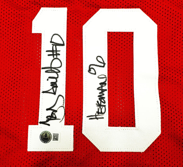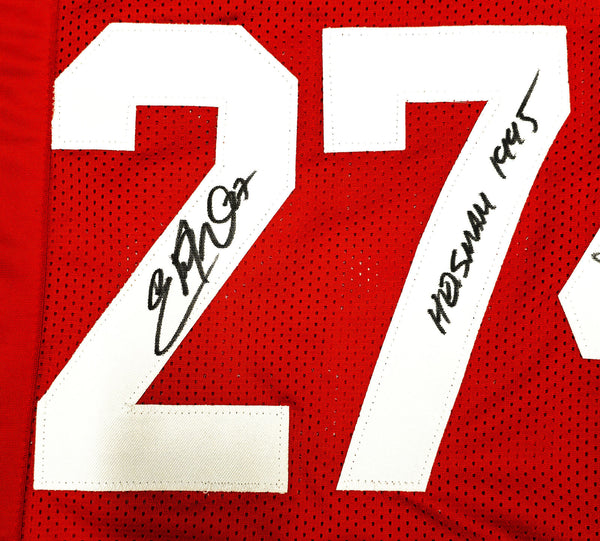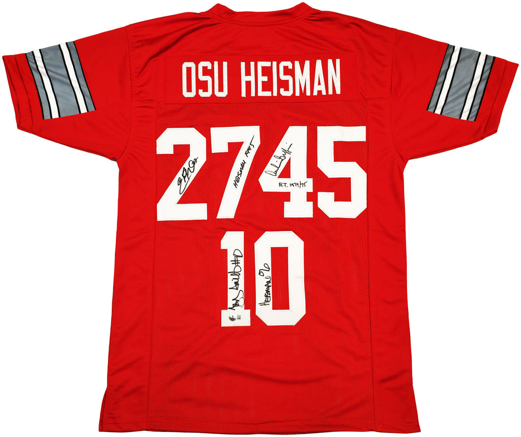 This is a Red Jersey that has been hand signed by Heisman Trophy Winners Archie Griffin, Eddie George & Troy Smith. This is a custom jersey with no name brand. The approximate size is XL. It has nice sewn in name and numbers. This item has been witnessed and certified authentic by Beckett Authentication (BAS) and comes with their tamper-proof witness sticker.