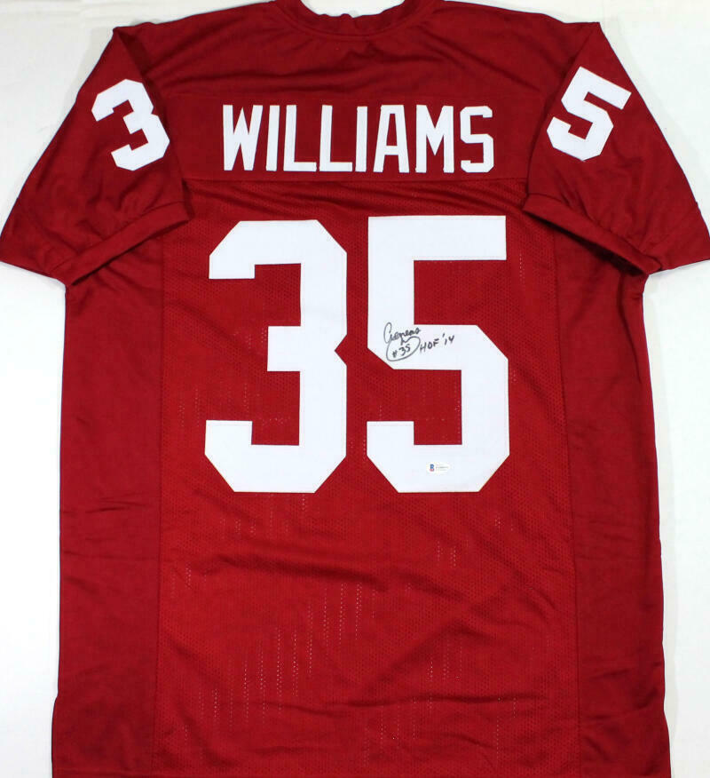 Aeneas Williams Autographed Dark Red Pro Style Jersey w/ HOF - Beckett W Auth *5 THIS IS NOT AN NFL JERSEY. THIS HAS NO TAGS, NO LOGOS, NO EMBLEMS. This is a hand autographed Jersey of Aeneas Williams. This item is inscribed with HOF. This is Custom Made (non name brand) Authentic Style (stitched letters and numbers). This item has a Beckett Witnessed Authentication, which comes with a numbered and a matching Beckett Certificate of Authenticity. You can view this item on the Beckett Authentication website, it shows when and where the item was signed. It was signed either at a public autograph appearance or a private signing. This is a stock photo of the item. Although you may not receive this exact item, the item you receive is virtually identical and brand new in great shape. Jersey size is XL.