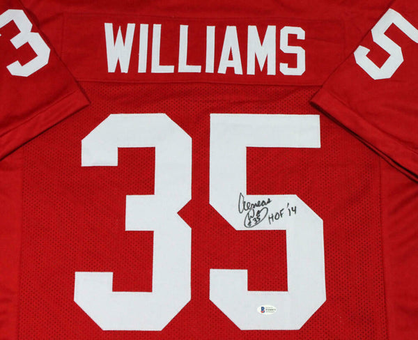 Aeneas Williams Autographed Red Pro Style Jersey w/ HOF - Beckett W Auth *5 THIS IS NOT AN NFL JERSEY. THIS HAS NO TAGS, NO LOGOS, NO EMBLEMS. This is a hand autographed Jersey of Aeneas Williams. This item is inscribed with HOF. This is Custom Made (non name brand) Authentic Style (stitched letters and numbers). This item has a Beckett Witnessed Authentication, which comes with a numbered and a matching Beckett Certificate of Authenticity. You can view this item on the Beckett Authentication website, it shows when and where the item was signed. It was signed either at a public autograph appearance or a private signing. This is a stock photo of the item. Although you may not receive this exact item, the item you receive is virtually identical and brand new in great shape. Jersey size is XL.