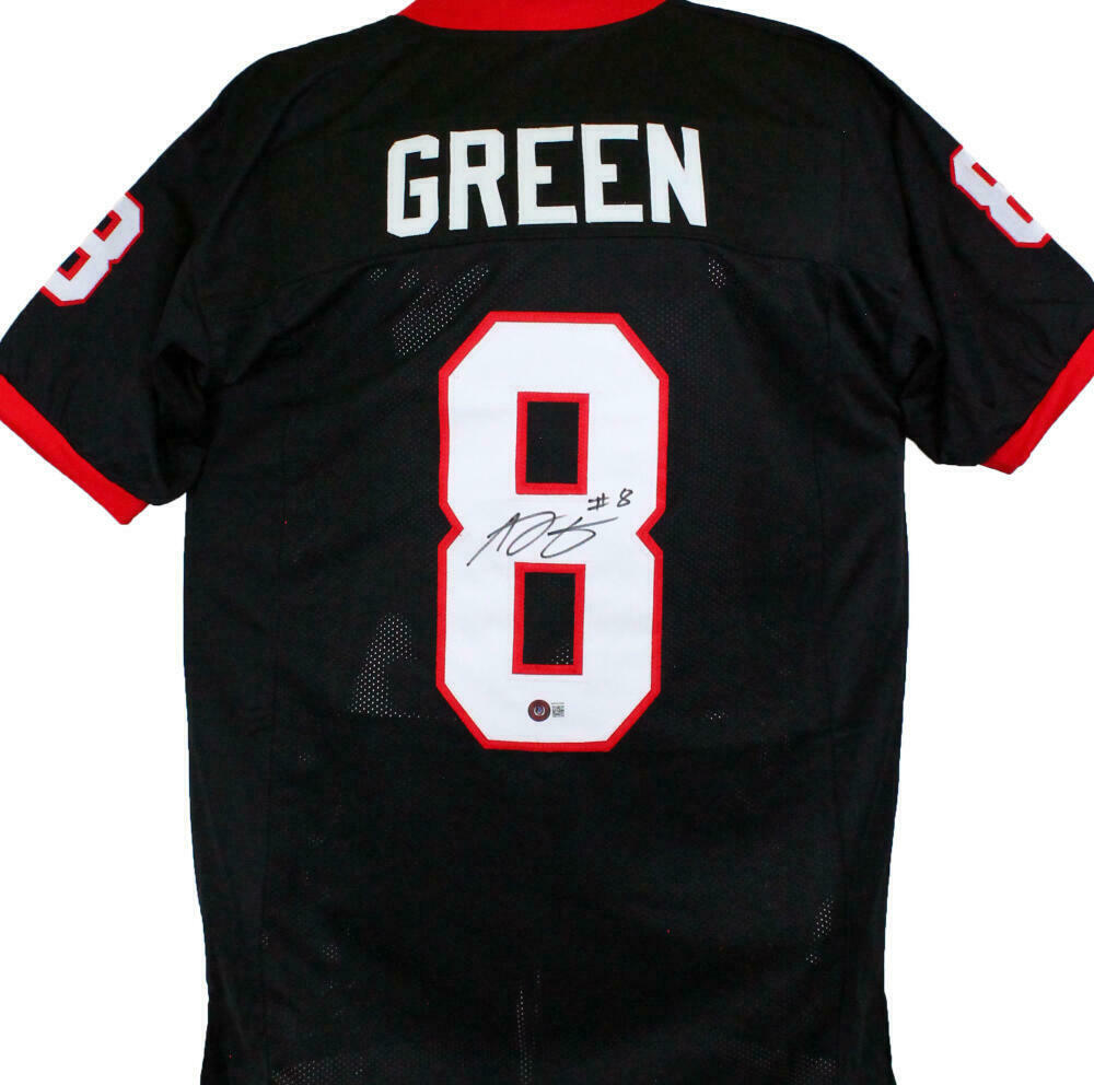 THIS IS NOT AN NCAA JERSEY. THIS HAS NO TAGS, NO LOGOS, NO EMBLEMS. This is an AJ Green of the Georgia Bulldogs hand autographed custom made (Non Name Brand) authentic style (stitched letters and numbers) jersey. This item has a Beckett Witnessed Authentication, which comes with a numbered hologram. You can view this item on the Beckett website to see when and where it was signed. It was signed either at a public autograph appearance or a private signing. This is a stock photo of the item. Although you may not receive this exact item, the item you receive is virtually identical, brand new, and in great shape. Jersey size is XL. THIS IS NOT AN NCAA JERSEY. THIS HAS NO TAGS, NO LOGOS, NO EMBLEMS. This is an AJ Green of the Georgia Bulldogs hand autographed custom made (Non Name Brand) authentic style (stitched letters and numbers) jersey. This item has a Beckett Witnessed Authentication, which comes with a numbered hologram. You can view this item on the Beckett website to see when and where it was signed. It was signed either at a public autograph appearance or a private signing. This is a stock photo of the item. Although you may not receive this exact item, the item you receive is virtually identical, brand new, and in great shape. Jersey size is XL.