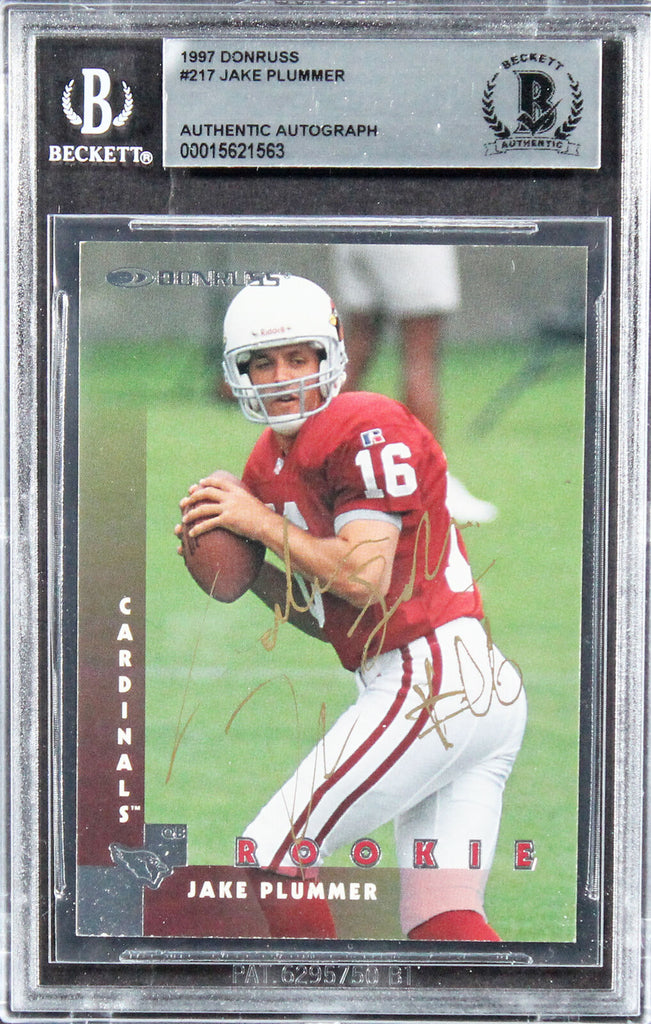 This Autographed 1997 Donruss #217 Rookie Card has been Personally Signed by Jake Plummer of the Arizona Cardinals. This item is 100% Authentic, it comes slabbed and authenticated by Beckett Authentication Services. The authenticity can be verified on Beckett Authentication Services website.
