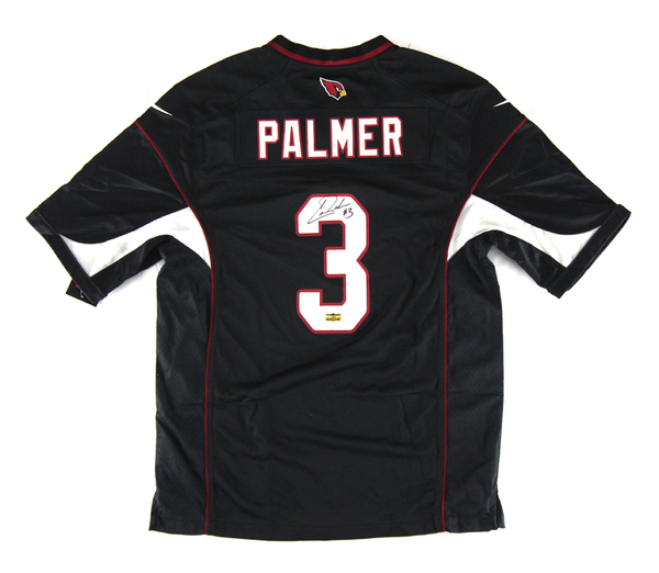 An Arizona Cardinals Black Nike Jersey hand signed by Carson Palmer. The item and signature are in excellent condition. AUTHENTICATION: The item features a Certificate of Authenticity, Serial Numbered and Databased Hologram - Picture of Carson from the signing -