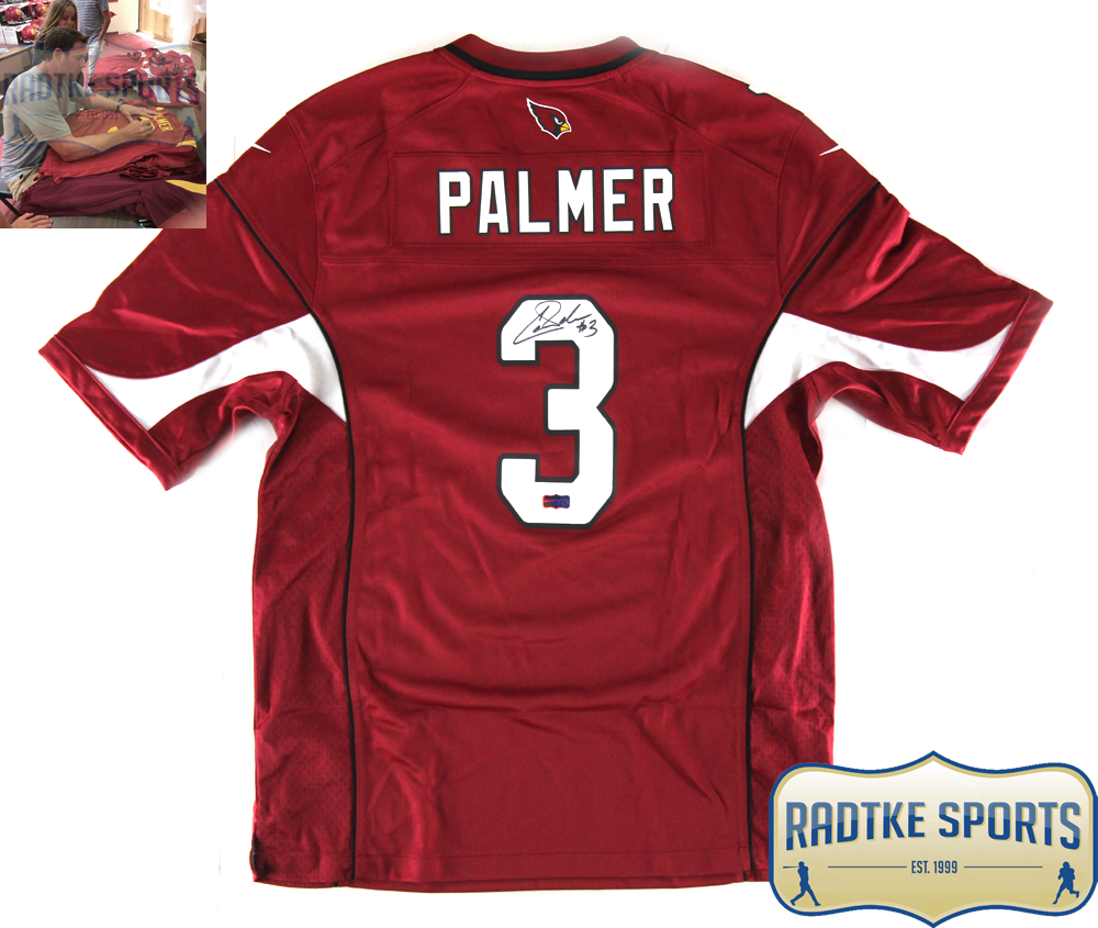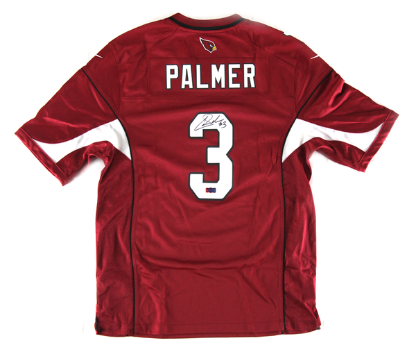 An Arizona Cardinals Red Nike Jersey hand signed by Carson Palmer. The item and signature are in excellent condition. AUTHENTICATION: The item features a Certificate of Authenticity, Serial Numbered and Databased Hologram - Picture of Carson from the signing -