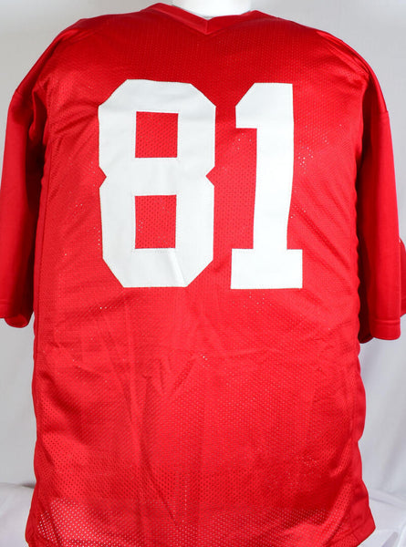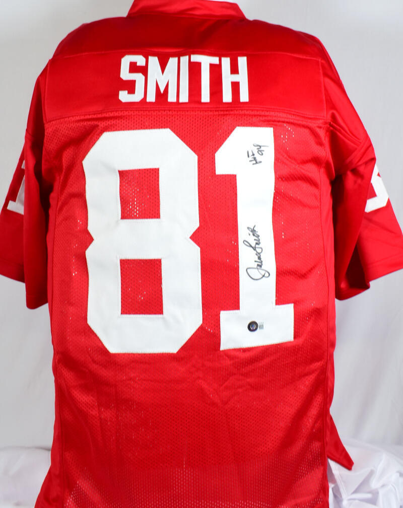 Jackie Smith Autographed Red Pro Style Jersey w/HOF- Beckett W Hologram *Black Jackie Smith Autographed Red Pro Style Jersey With Hall of Fame Inscription and Beckett Witness Authentication THIS IS NOT AN NFL JERSEY. THIS HAS NO TAGS, NO LOGOS, NO EMBLEMS. This is a Hand Autographed Jersey of Jackie Smith. This is Custom Made (Non Name Brand) Authentic Style (Stitched Letters and Numbers). This item has a Beckett Witness Authentication, which Comes with a Beckett #'ed hologram and a QR code for verification. You can view this item on the Beckett website. It was signed either at a public autograph appearance or a Private Signing. This is a stock photo of the item. Although you may not receive this exact item, the item you receive is virtually identical and brand new in great shape. Jersey size is XL.