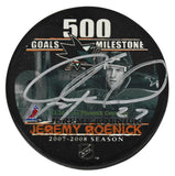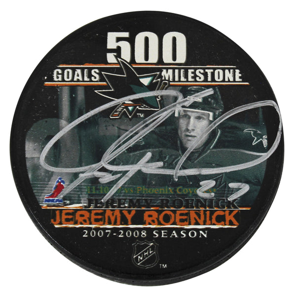 This Autographed 500 Goal Milestone Commemorative Puck has been Personally Signed by Jeremy Roenick of the Arizona Coyotes. This item is 100% Authentic to include a hologram by Beckett Authentication Services. This item will come with an affixed Beckett Authentication Services (BAS) authentication sticker, which includes a scannable QR code to verify authenticity. Please note that Beckett no longer provides serial-numbered COA cards, and the attached BAS sticker will serve as the complete authentication for this item. The authenticity can be verified on Beckett Authentication Services website.