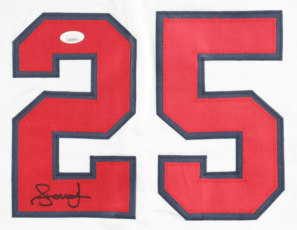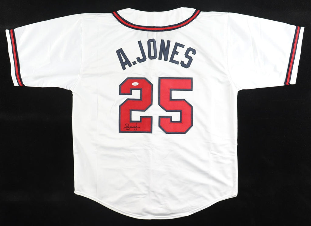 Custom on-field style jersey. Everything is sewn on, size XL. Hand-signed in black felt-tip pen by Andruw Jones. The autograph(s) includes an official James Spence Authentication (JSA) hologram and QR Code card for authenticity purposes.Authentication: JSA Hologram with QR Code card