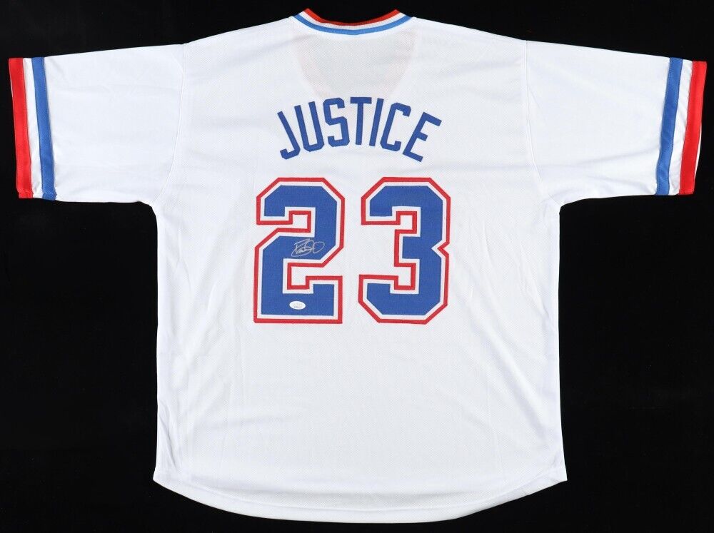 Custom on-field style jersey. Everything is sewn on, size XL. Hand-signed in silver paint pen by David Justice. The lot / autograph(s) includes an official James Spence Authentication (JSA) hologram and matching COA for authenticity purposes. Authentication: JSA COA