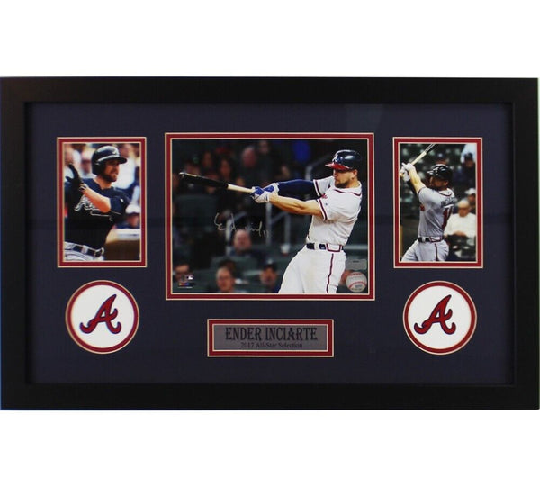 An Atlanta Braves Framed 8x10 MLB Photo hand signed by Ender Inciarte. The item and signature are in excellent condition. The frame measures approximately 26"x16". The framed photo is accompanied by two 4"x6" photos. Ender joined the Braves in 2014. Since he has joined he won the Gold Glove Award in 2016, had 85 runs scored and seven triples. AUTHENTICATION: The item is accompanied by a Certificate of Authenticity, Serial Numbered and Databased Hologram, and picture of Ender from the signing