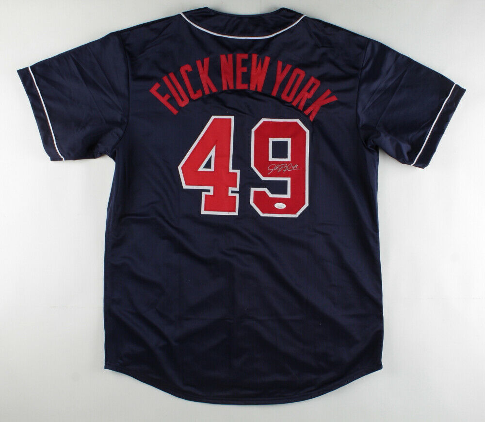 Custom on field style jersey. Everything is sewn on, size XL. Hand-signed in silver paint pen by John Rocker.During an interview, he spoke of his opinion of the Mets and their fans: Nowhere else in the country do people spit at you, throw bottles at you, throw quarters at you, throw batteries at you and say, "Hey, I did your mother last night--she's a whore." I talked about what degenerates they were and they proved me right. The lot / autograph(s) includes an official James Spence Authentication (JSA) hologram and matching COA for authenticity purposes. The signing of this item was witnessed by JSA.Authentication: JSA COA