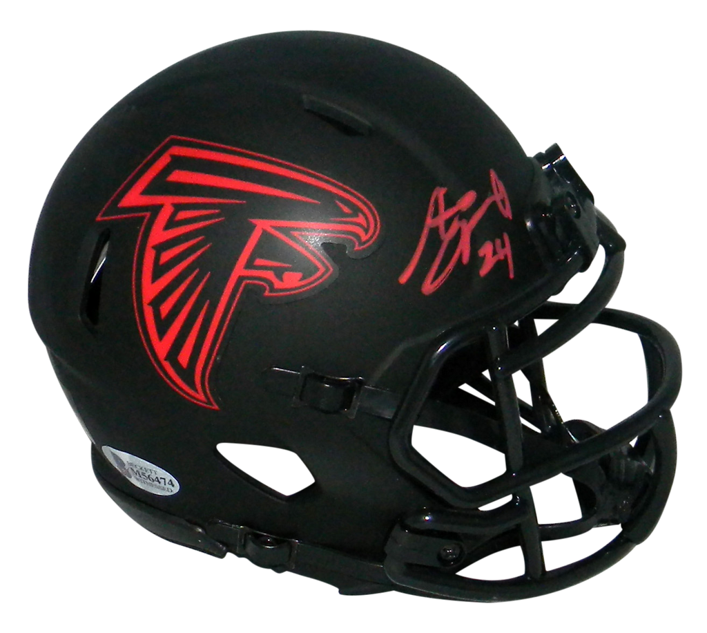 AJ Terrell, star cornerback for the Atlanta Falcons, has hand signed this Falcons Riddell Speed Eclipse mini helmet at a private signing. This item comes with a certificate of authenticity (COA) from Beckett Authentication Services and was signed in the presence of one of their representatives. You will receive a serial-numbered COA along with a matching serial-numbered sticker on the helmet. The authenticity can be verified online by entering the serial number.Item pictured may not be the exact item you will receive. It will be similar quality, and we guarantee your satisfaction.